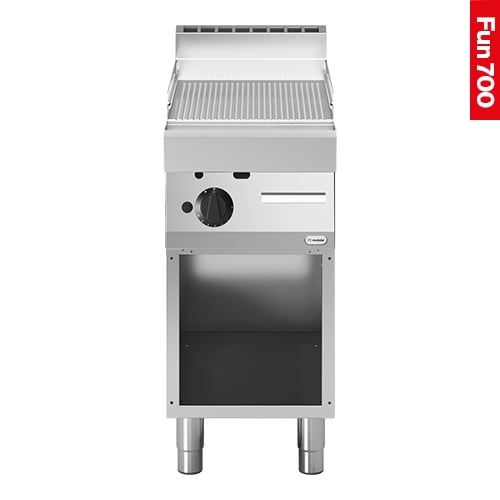maximaal benut bakplaat oppervlak met zeer korte opwarmtijd d.m.v. een dubbele gasbrander, bakplaat vervaardigd van gegoten en glad geslepen speciaal staal, met extra grote ingebouwde vetopvanglade,