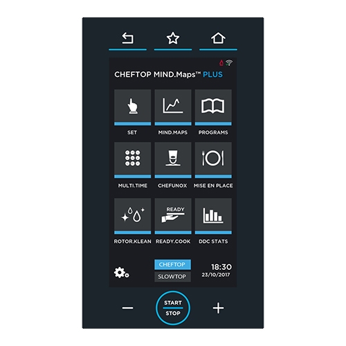 de UNOX Mind.Maps PLUS onderscheidt zich door het fraaie design en het bedieningsgemak van het 9,5 inch capacitieve bedieningsdisplay, hiermee kunnen gerechten handmatig bereid worden of gebruik de revolutionaire Mind.Maps technologie, maar het geeft ook toegang tot een lijst met bereidingscycli die eerder zijn opgeslagen of er kunnen nieuwe recepten gemaakt en opgeslagen worden. De oven beschikt o.a. over Adaptive.Cooking voor altijd een perfect resultaat, Multi.Time dat u in staat stelt om verschillende producten tegelijk te bakken met behulp van 10 timers en Mise.en.Place waardoor alle gerechten op dezelfde tijd klaar zijn, met CHEFUNOX heeft u beschikking over een voorgeprogrammeerde bibliotheek met programma’s voor een maximaal kookresultaat. De Dry.Maxi technologie draagt zorg voor afvoer van vocht uit de oven, Steam.Maxi voor perfect stomen, Air.Maxi voor een perfecte heteluchtcirculatie en het automatische reinigingssysteem Rotor.Klean draagt zorg voor een schone ovenruimte. Met behulp van de geïntegreerde WIFI-module bestaat de mogelijkheid om o.a. uw receptenboek op afstand te beheren, te synchroniseren en het verbruik van uw oven te monitoren.,