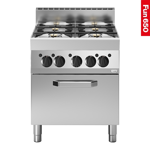 gasfornuis met 4 zware koperen branders voorzien van geëmailleerde morspannen en statische gasoven, de oven heeft een binnenafmeting van 28(H)x57x54cm, met uitneembare geleiders en een rooster van 53x53cm,