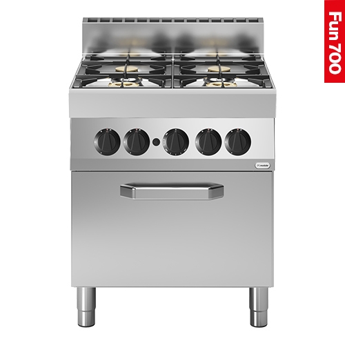 gasfornuis met 4 zware koperen branders voorzien van geëmailleerde morspannen en gasoven, de oven beschikt over uitneembare geleiders, binnenafmeting van de oven is 27(H)x55,5x54cm en wordt geleverd met oven rooster 53x53cm,