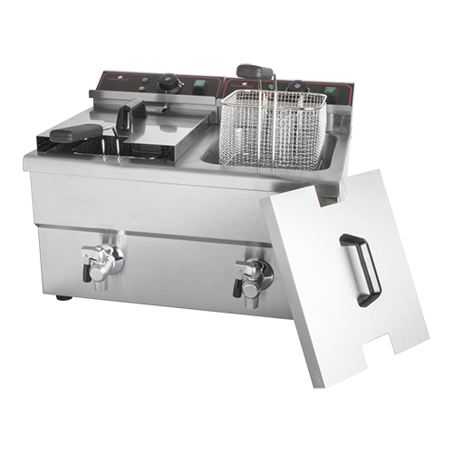 geheel uit roestvrijstaal vervaardigde friteuse, model is o.a. voorzien van EGO thermostaat, koude zone en aftapkraan (pan niet uitneembaar), verhittingselement gemakkelijk te verwijderen wat het onderhoud en reiniging vereenvoudigt,