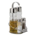 roestvrijstalen houder met peper- en zoutvaatje en olie- en azijnflesje,