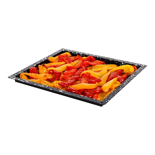 Om het reinigen van de ovenschaal te vergemakkelijken, zijn speciale witte spikkels met een diameter tussen 1 en 4 mm op het oppervlak aangebracht. Door dit speciale procédé blijft het vuil discontinu plakken, waardoor het schoonmaken een stuk eenvoudiger wordt,