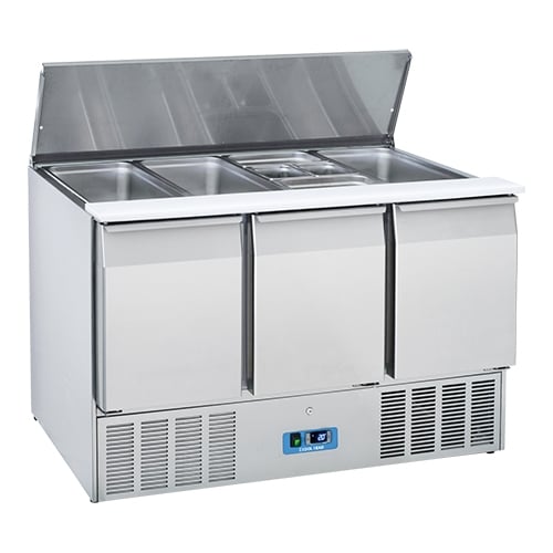 roestvrijstaal, met geventileerde koeling, automatische ontdooiing en verdamping van het condenswater, volledig geïsoleerd, thermostatisch regelbaar van 0°C / +8°C en voorzien van verlichte hoofdschakelaar, de onderruimte is voorzien van geleiders die plaats bieden aan GN bakken en/of roosters, de bovenruimte biedt plaats aan GN bakken 100mm diep, met roestvrijstalen klapdeksel en kunststof snijplateau, wordt geleverd met een 1/1GN rooster rilsan per deur maar zonder GN bakken, bovenruimte 4x 1/1GN,