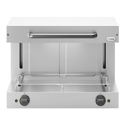 de Modular salamander, uitgevoerd in roestvrijstaal, is een multifunctionele apparaat voor het verwarmen, gratineren en braden van gerechten. Het beweegbare systeem maakt het mogelijk om de afstand van het verwarmingselement tot het voedsel te vergroten of verkleinen, afhankelijk van de gewenste bereidingswijze, uitgerust met twee onafhankelijk instelbare verhittingszones. Voorzien van GN1/1 rooster in verchroomd RVS en vaste RVS vetopvangbak in kantelvrij frame,