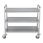 zware roestvrijstalen uitvoering met 3 niveau’s, voorzien van 4 zwenkwielen waarvan 2 geremd, elk blad heeft een afmeting 90×50 cm en kan een gewicht dragen van 80kg per blad,
