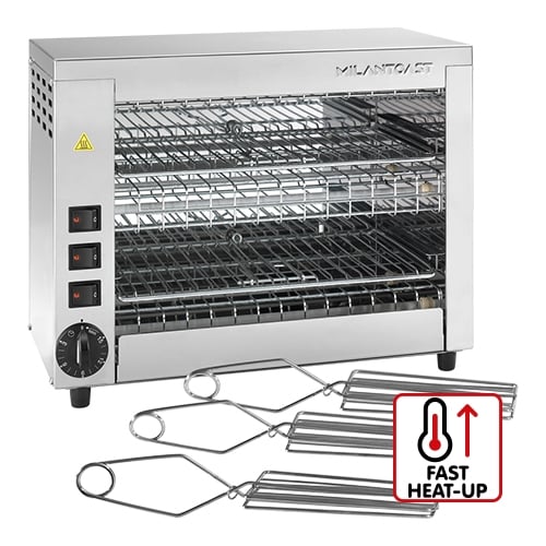 de quartzbuizen kunnen onder en boven afzonderlijk bedient worden en daardoor is het tosti apparaat ook zeer geschikt voor o.a. gratineren en grillen, dit wordt nog eenvoudiger gemaakt door de opklapbare achterzijde, het apparaat is voorzien van een tijdklok en lekbak,