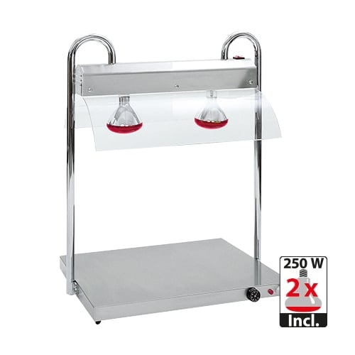 modern in design met verchroomde staanders en eenvoudig in gebruik, houdt uw gerechten en snacks op de juiste temperatuur tot het moment van uitserveren. Dit model beschikt over een apart inschakelbare warmhoudplaat en infraroodlampen, de warmhoudplaat is thermostatisch instelbaar tot 90°C. Compleet met hygiënische beschermkap van acrylglas en daardoor zeer geschikt voor o.a. buffetopstellingen,