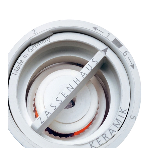 stel eenvoudig de maalgraad in van het keramische precisie maalwerk van extra fijn tot extra grof, in zes niveaus weergegeven op de molenvoet. De maalwerken in de Zassenhaus molens van beukenhout kenmerken zich door hun lange levensduur,